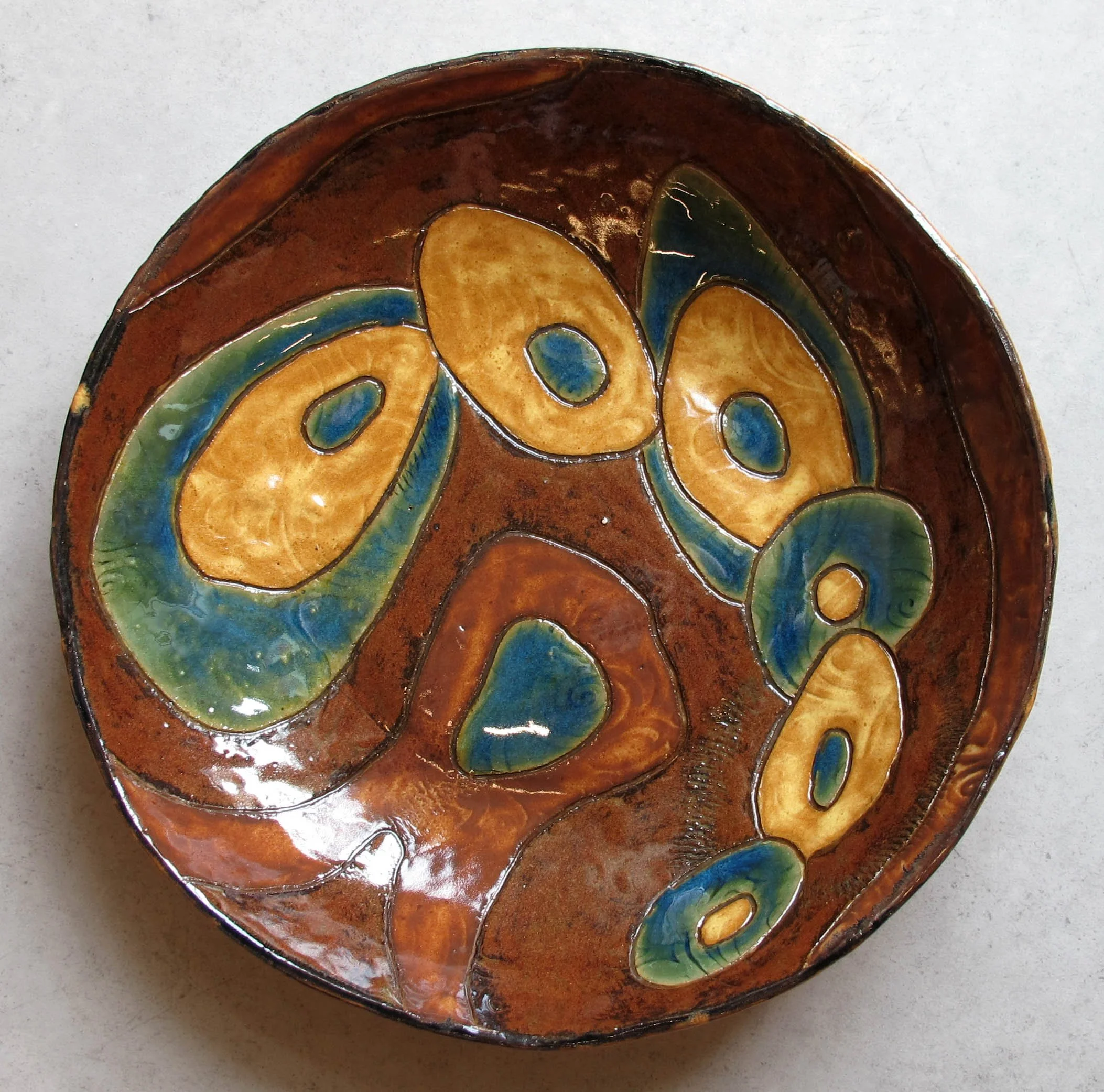 Bowls come in three sizes: 9" x 9" x 2", 11" x 11" x 2" and 13" x 13" x 3". They are hand built of cone 6 stoneware, carved in low relief and glazed. Their shape is slightly irregular. Their design is inspired by forms taken from nature. They are functional and decorative, microwave and dishwasher safe.